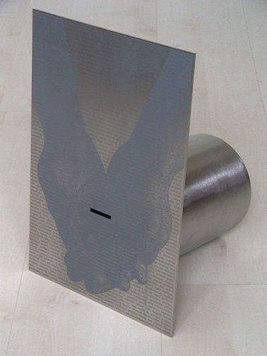 Donations Box: Laser cut and photo-etched stainless steel. H.48cm, W.27cm, D.30cm.
